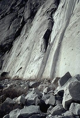 The smooth granite walls in Yosemite Valley, polished in the ice ages of the past, occasionally yield chunks of granite to gravity, and these crash to the base of the walls. In some places, like this one not far from Yosemite Lodge, the substantial buildup of rockfall suggests that it is not a place to sit and picnic!