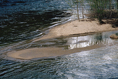 In the late afternoon light, looking down from a bridge in the Valley, a sand bar island gently parts the Merced River, which flows gently by on both sides.